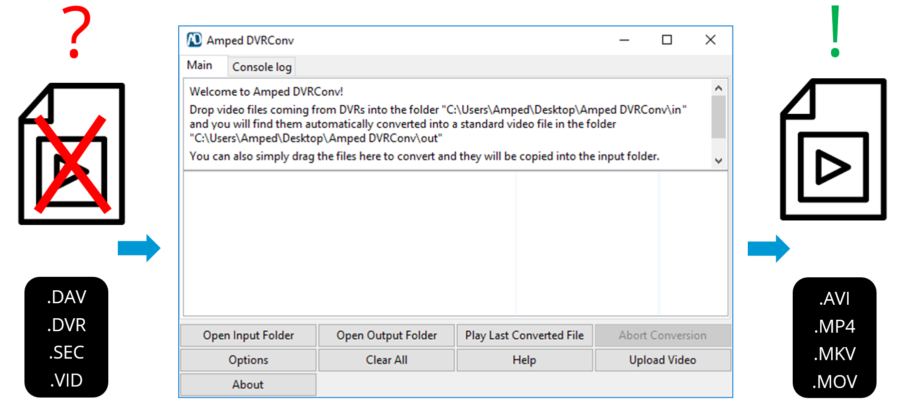 Amped DVRConv is the only tool of its kind on the market. With Amped DVRConv, the process is fast and easy. Simply drag videos in batch into a specified folder or onto the application window and see them automatically convert to a user configurable format.