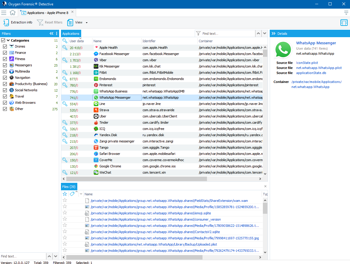 The applications section displays user data that has been extracted and parsed from popular Social Networks, Messengers, Web Browsers, Navigation, Productivity, Travel, Finance, Fitness, Drone and Multimedia apps. Investigators can view app account details, contacts, messages, calls, logs, cache, and other relevant data. Even encrypted apps are decrypted and displayed in this area!