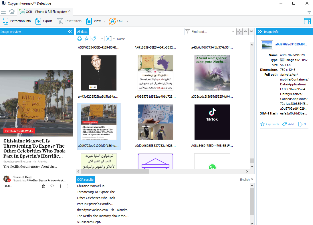 Investigators no longer have to spend time manually transcribing text within a picture. Oxygen Forensic® Detective includes the OCR section, which allows investigators to easily convert any words contained in a screenshot or photo to machine-encoded text. To enable and configure this feature, go to Options/Advanced Analytics in the software. Then, in the OCR section, run image OCR by pressing the relevant button on the toolbar. Once OCR has been run investigators can use the quick filter to search for text across the processed images.
