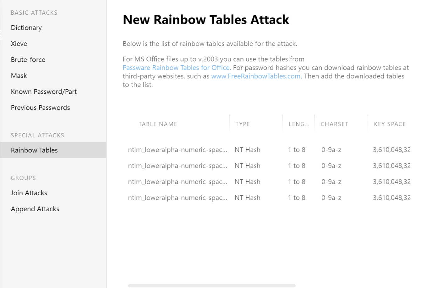 Passware Rainbow Tables for Windows is a ready set of rainbow tables shipped on a USB HDD designed for immediate recovery of Windows user passwords from NTLM hashes. The drive is shipped with 3.6 TB of rainbow tables in RTI2 format. The decryption is performed locally.