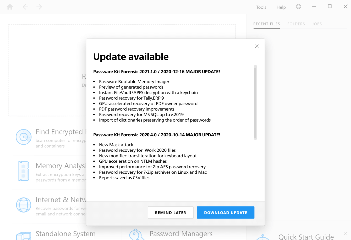 All Passware Kit Business and Passware Kit Forensic orders come with a one-year Software Maintenance and Support (SMS) Subscription. New features are being added to Passware Kit on a regular basis with four major releases and multiple minor updates per year. This release cycle has been strictly followed for over 10 years.