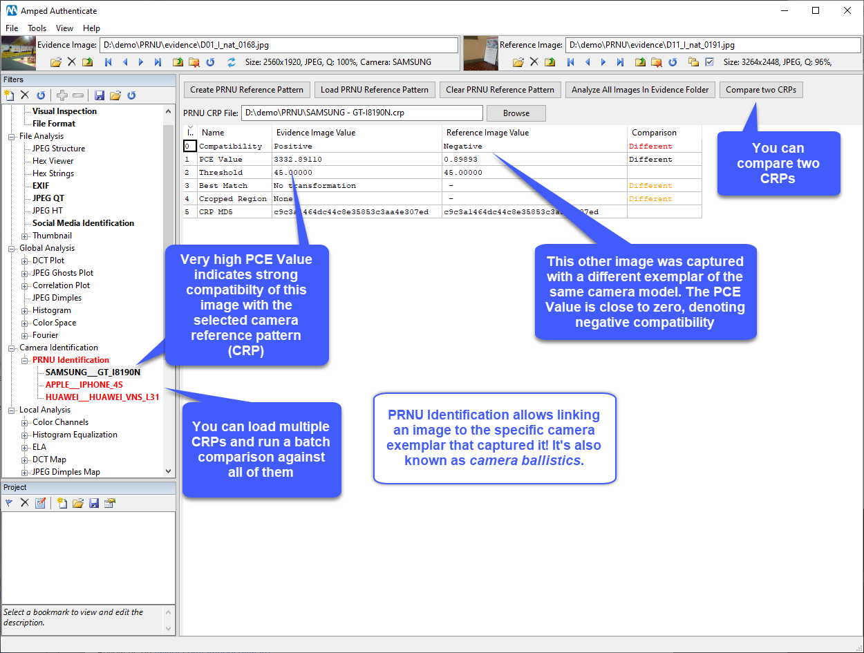 Amped Authenticate empowers law enforcement agencies and forensic lab experts with very effective tools to identify tampering on an image and to verify if a digital photograph has been generated by a specific device. The camera ballistics feature in Amped Authenticate determines that a specific device - and not just the camera make or model – was used to generate a specific photo