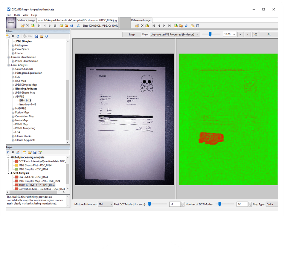 All tools available in Amped Authenticate are based on peer reviewed scientific papers, each performing a different test on the structure of an image and how it was created.