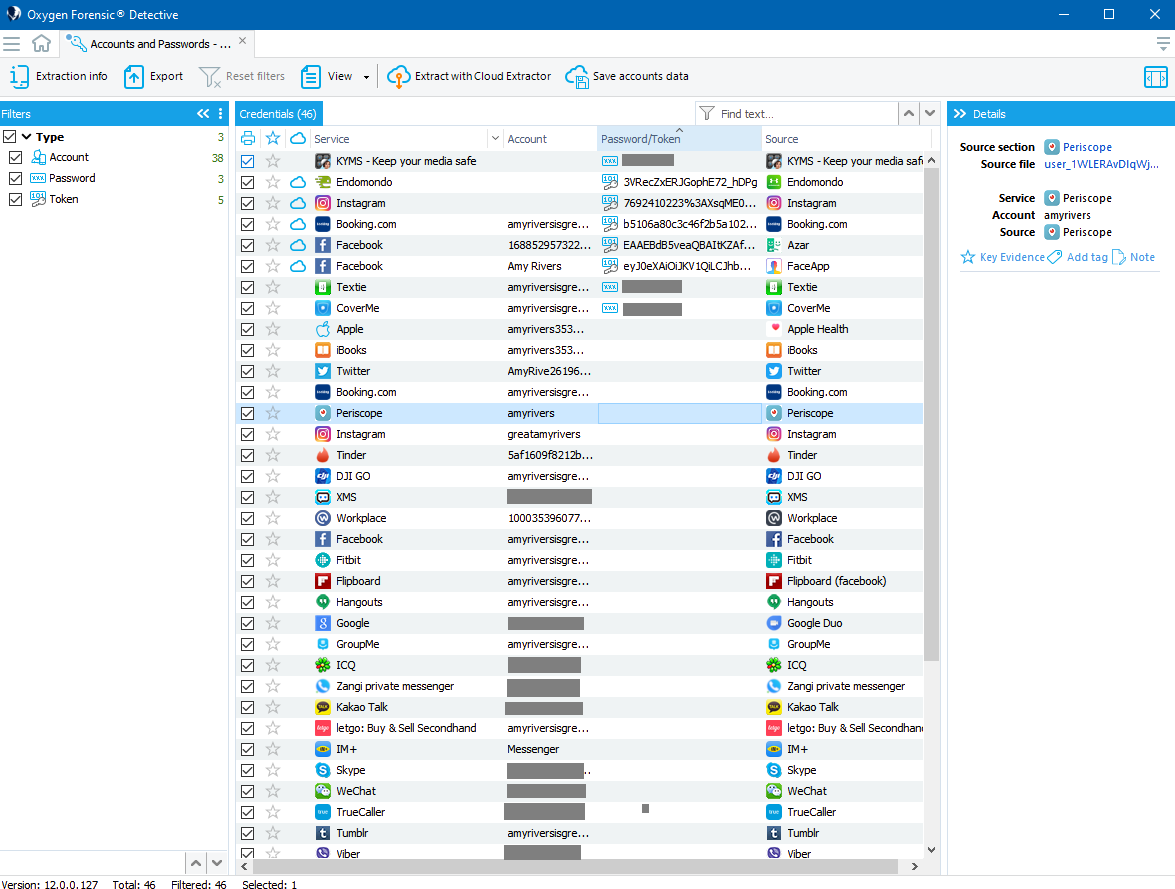 The Accounts and Passwords section displays logins, passwords and tokens extracted mobile devices. The program decrypts credentials from the iOS keychain and Android KeyStore, finds them in application databases and web forms. Investigators can find passwords and tokens to various applications